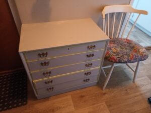 Hallbyrån är ommålad och klar. Läda nummer 2 nerifrån kärvar lite, och öppnar mam den sista lådan så följer lådan över med. Det får jag leva med. Det blev mycket ljusare och fräschare i hallen nu.
