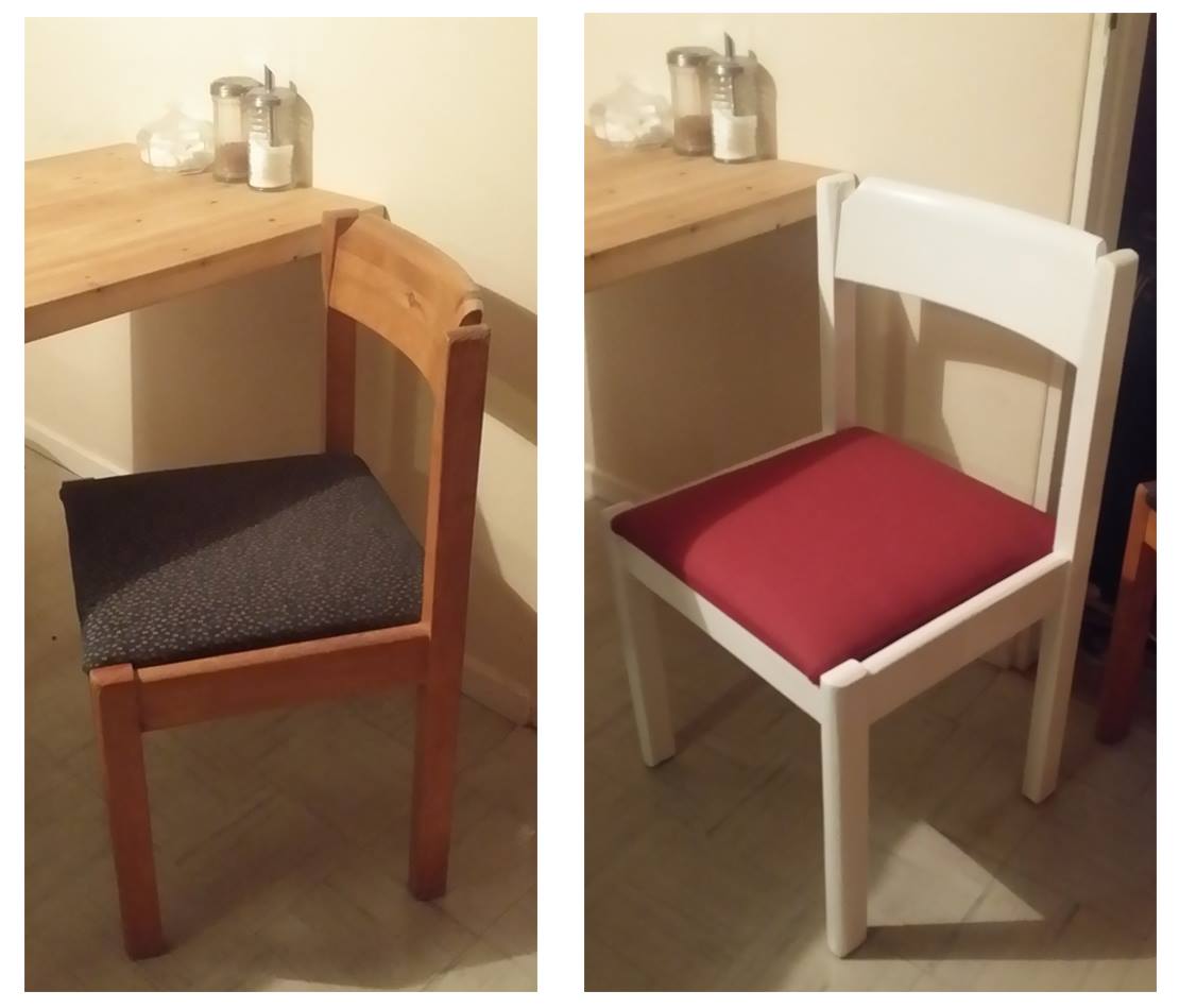 Vi testade att måla och tapetsera om en av de fula stolarna. Den blev helt klart bättre än innan, men modellen är inte i min smak och de passar definitivt inte till vårt omgjorda köksbord.
