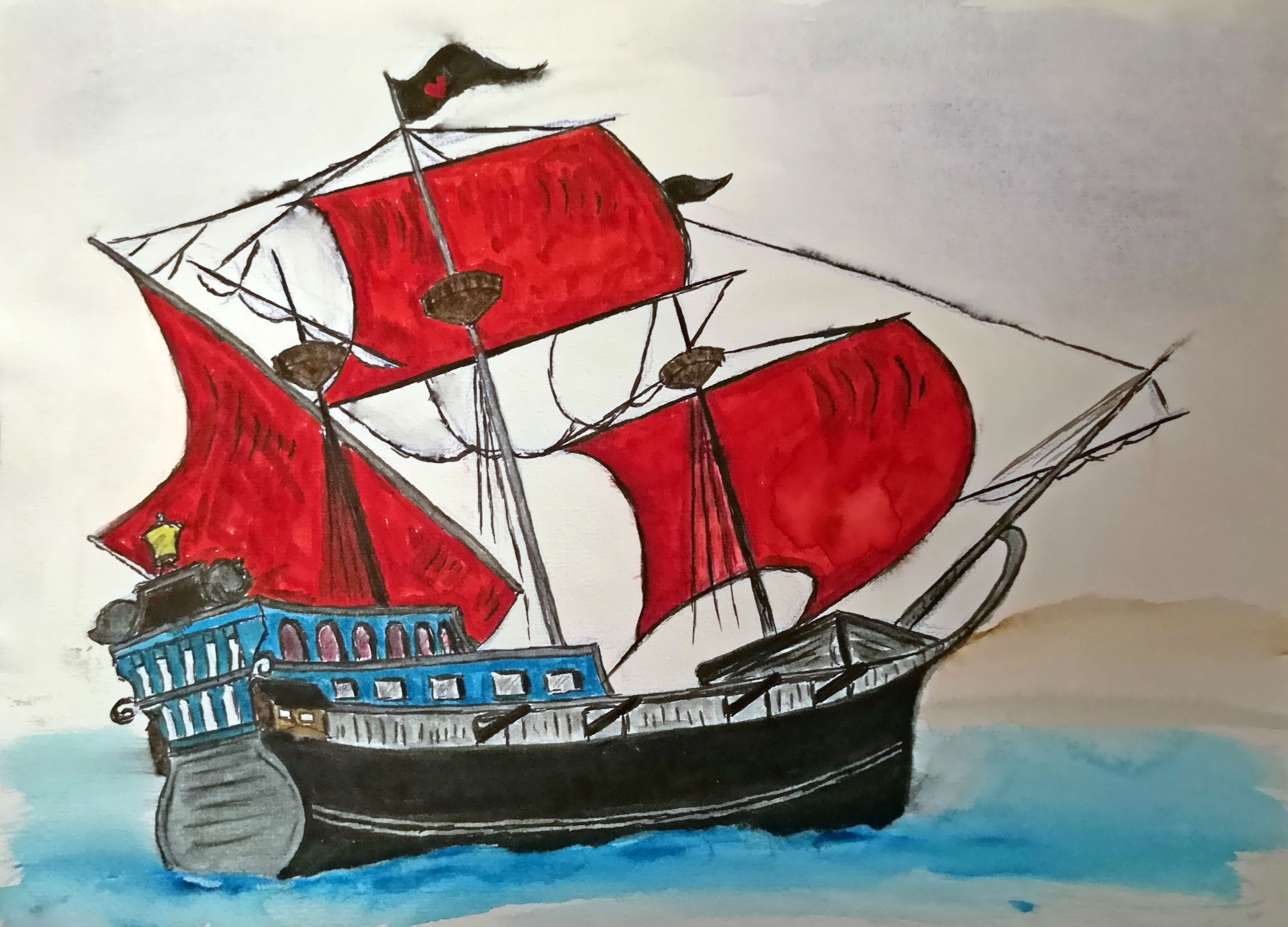 I Skaparglädje ritade vi av ett skepp steg för steg i akvarell och jag skissade först med akvarellpennor, målade med tuber med akvarell. Sedan valde jag att fylla i med akvarelltusch.